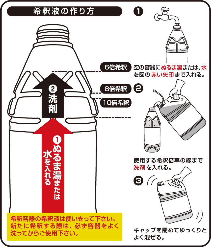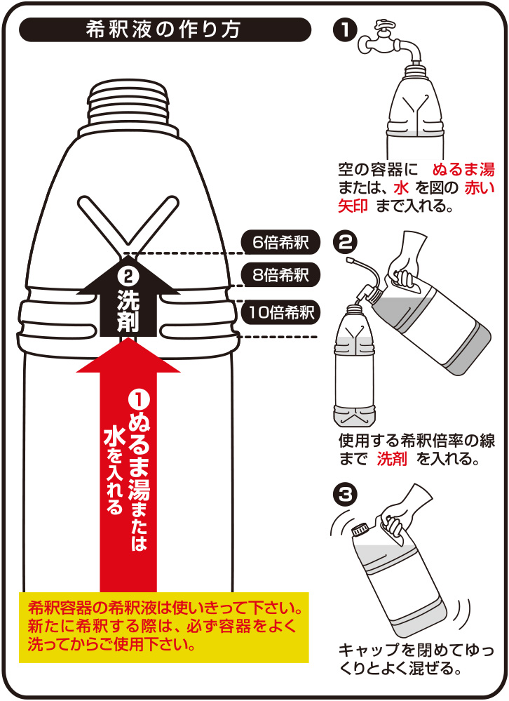 ●作業時は必ず保護メガネおよび炊事用ゴム手袋を着用する。 ●容器を強く持ってキャップを開けると液が飛び出す恐れがある。また、容器を移動する際は、キャップをしっかり閉める。ゆるんでいると液が飛んで目や皮ふにつく恐れがある。 ●換気の良い場所で使用する。 ●他の薬剤・洗浄剤とはまぜない。 ●使用中は飲食または喫煙をしない。 ●用途以外には使用しない。 ●子供の手の届く所に置かない。 ●取り扱い後はよく手を洗う。 ●うすめた液を長期間置いておくと変質することがあるので注意する。 ●他の容器に移して使用する場合には、必ず商品名を明記し、誤使用のないよう注意する。 ●野菜・果物を洗う時は5分以上つけたままにしない。 ●流水を用いてすすぐ場合、野菜・果物は30秒以上、食器及び調理器具は5秒以上、ため水の場合は水をかえて2回以上すすぐ。 ●使用後はよく手を洗い、クリームなどで手入れをする。 ●洗剤の粘度は季節(気温)により変化する。暑い時は低く、寒い時は高くなるが性能に問題はない。 ●洗剤の色調変化は性能、品質に影響はない。